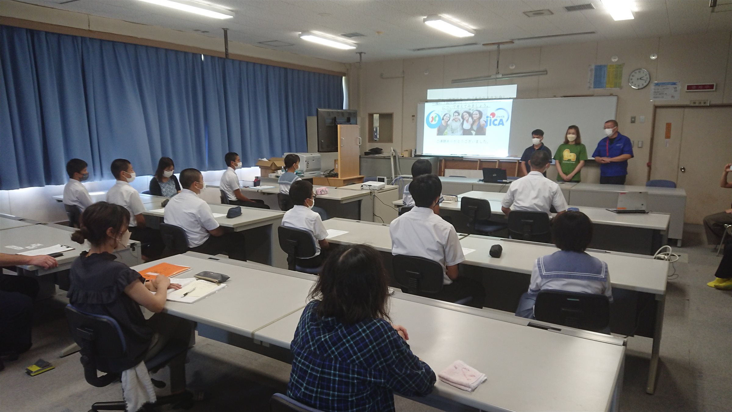 八代市の国際課とJICA九州(JICAデスク熊本)との連系にて、八代市内の各学校に訪問して、八代市国際課の取組みや、JICA海外協力隊の体験談(おしえてJICA海外協力隊)、そして技能実習生と学生との交流を行っています。